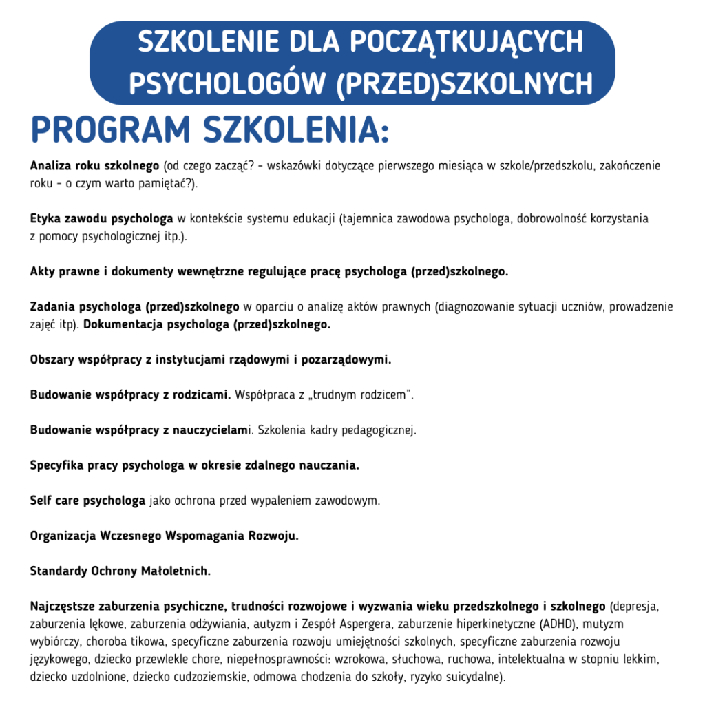 Szkolenie on -line “Szkolenie dla początkujących psychologów (przed)szkolnych” WERSJA STANDARD